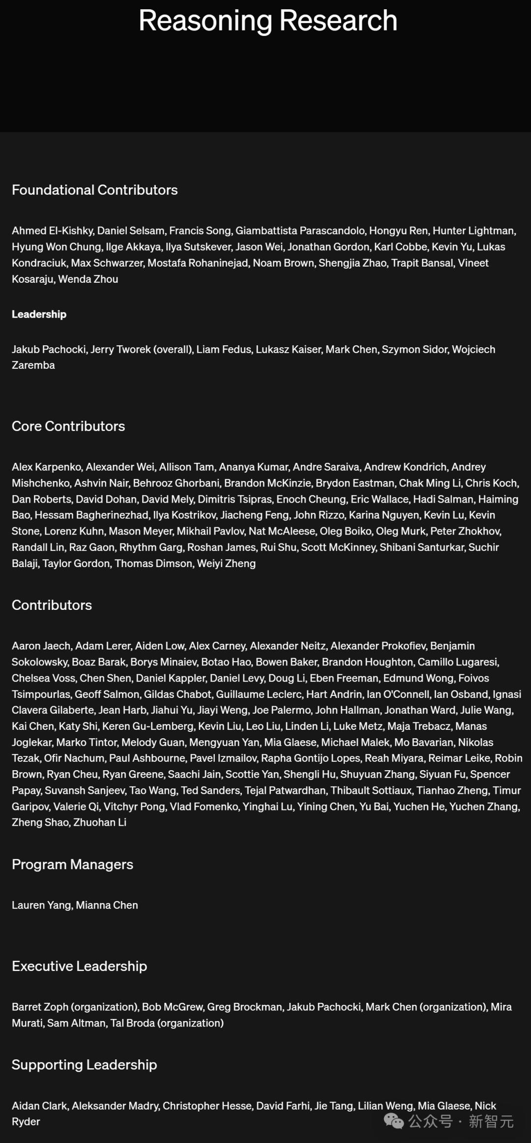 在奠基贡献者里,离职创业的Ilya Sutskever赫然在列,但并没有和Greg Brockman等人被列在执行管理(executive leadership)中,想必是他之前的研究工作为o1奠定了基础。