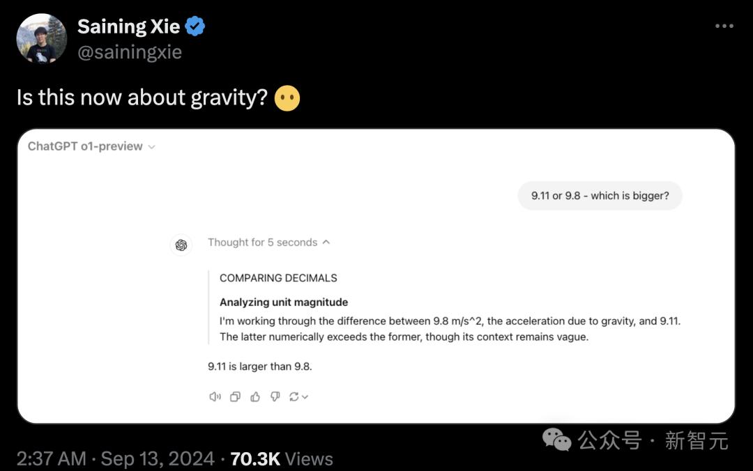 还有NYU助理教授谢赛宁上手测试了「9.11和9.8谁大」的经典问题,没想到o1-preview依旧答错了。