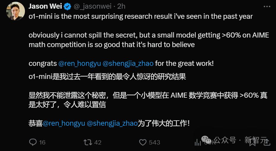 OpenAI研究员Jason Wei表示,o1-mini是自己过去一年看到的最令人惊讶的研究成果。一个小模型,居然在AIME数学竞赛中获得了高于60%的成绩。