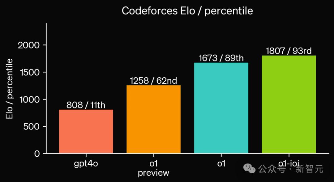 GPT-4o的Elo评分为808,位于人类选手11%的位置。而新模型则远远超过了GPT-4o和o1,达到了1807的高分,表现优于93%的选手。