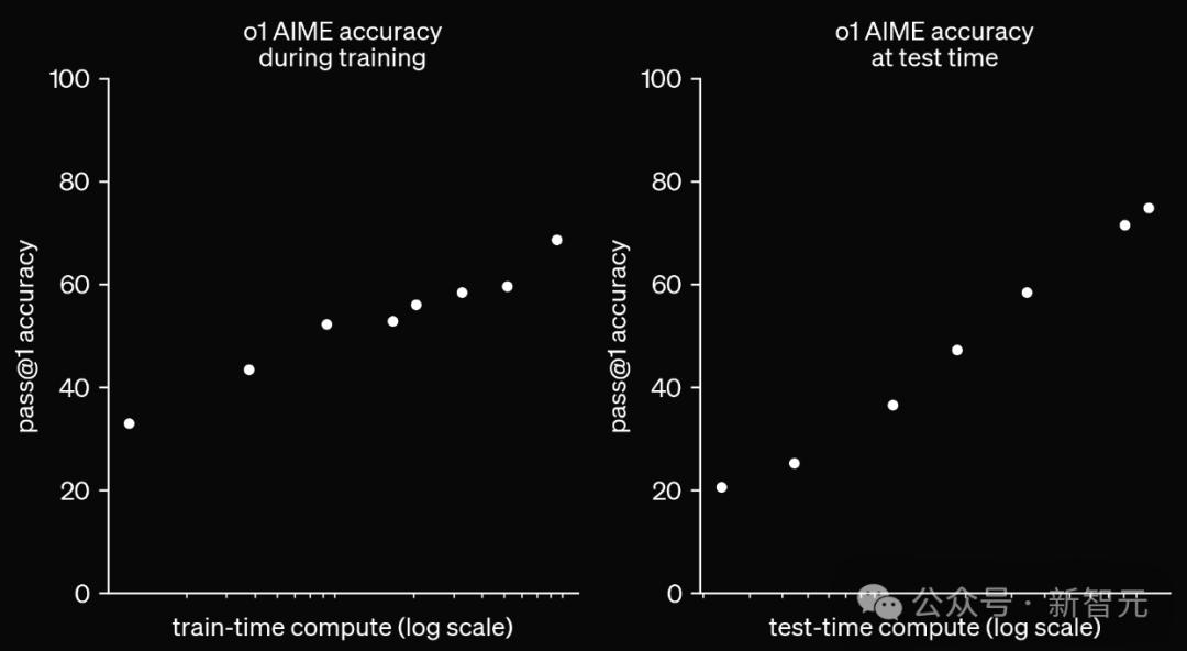 o1的性能,随着更多的强化学习(训练时间计算)和更多的思考时间(测试时间计算)投入,性能不断提高。