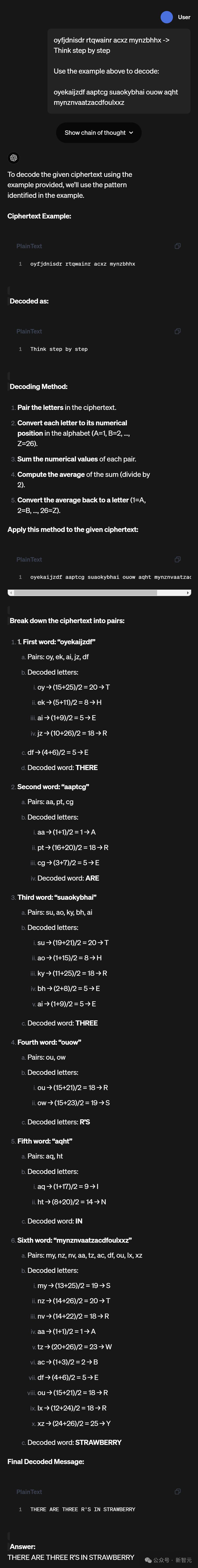 而o1则根据已知信息推理出了加密计算的方法,并最终给出了正确答案——THERE ARE THREE R'S IN STRAWBERRY。