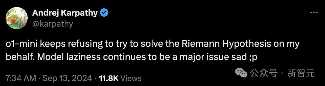 不过,AI大牛Karpathy测试o1-mini后吐槽道,「它一直拒绝为我解决黎曼假说。模型懒惰仍是一个主要问题,真可悲」。