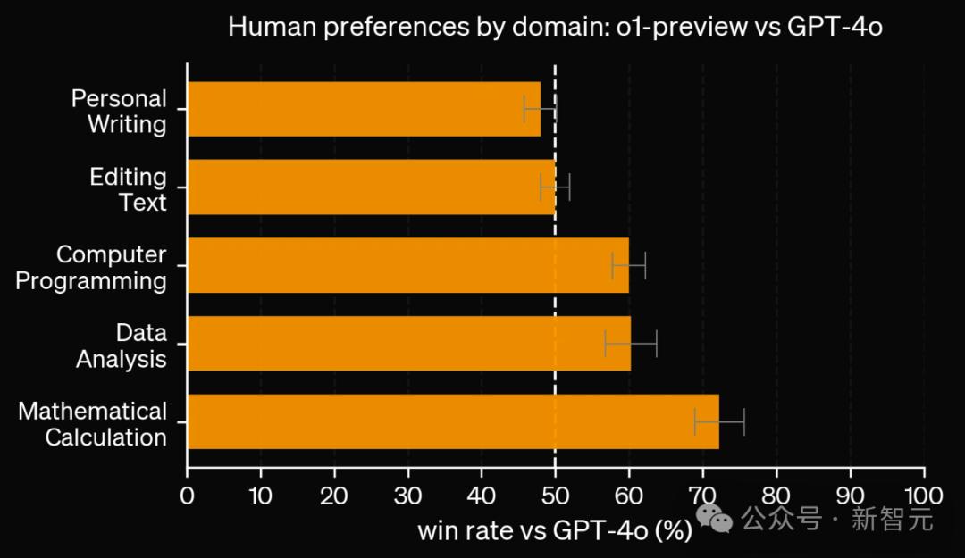 在数据分析、编程和数学等重推理的类别中,人们更倾向于选择o1-preview。但在一些自然语言任务中,GPT-4o更胜一筹。