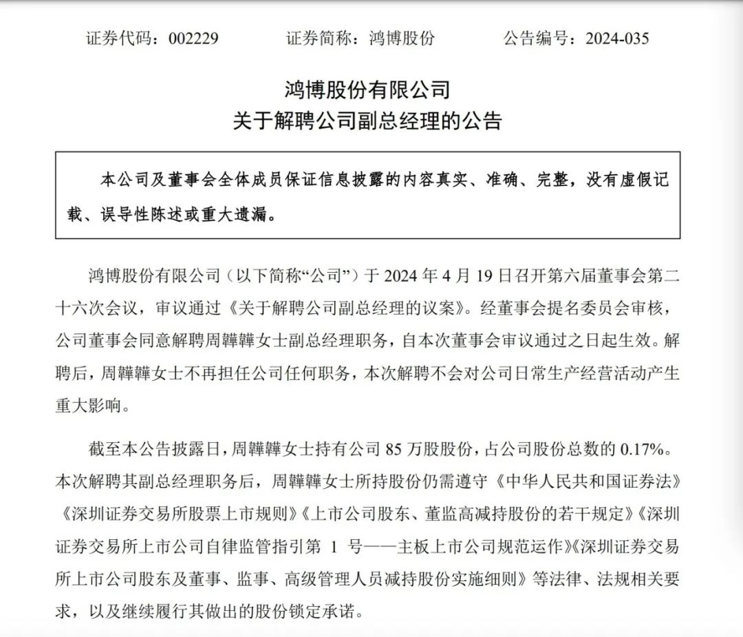 鸿博股份解聘英博数科前CEO周韡韡,图源:公司公告