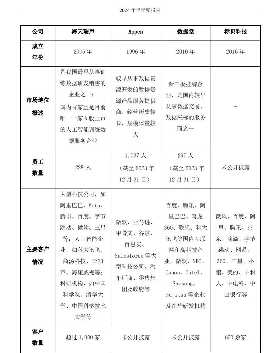 而海天瑞声成立于2005年,也是国内目前唯一一家 A 股上市的人工智能训练数据服务企业 ,在语音标注上有一定的积累。据其财报,目前客户数量已超过1000家,包括阿里、Meta、腾讯、微软、字节等均是其客户。尽管同比实现扭亏,但海天瑞声显然赚到是辛苦钱,上半年归母净利也仅有41.64万元。
