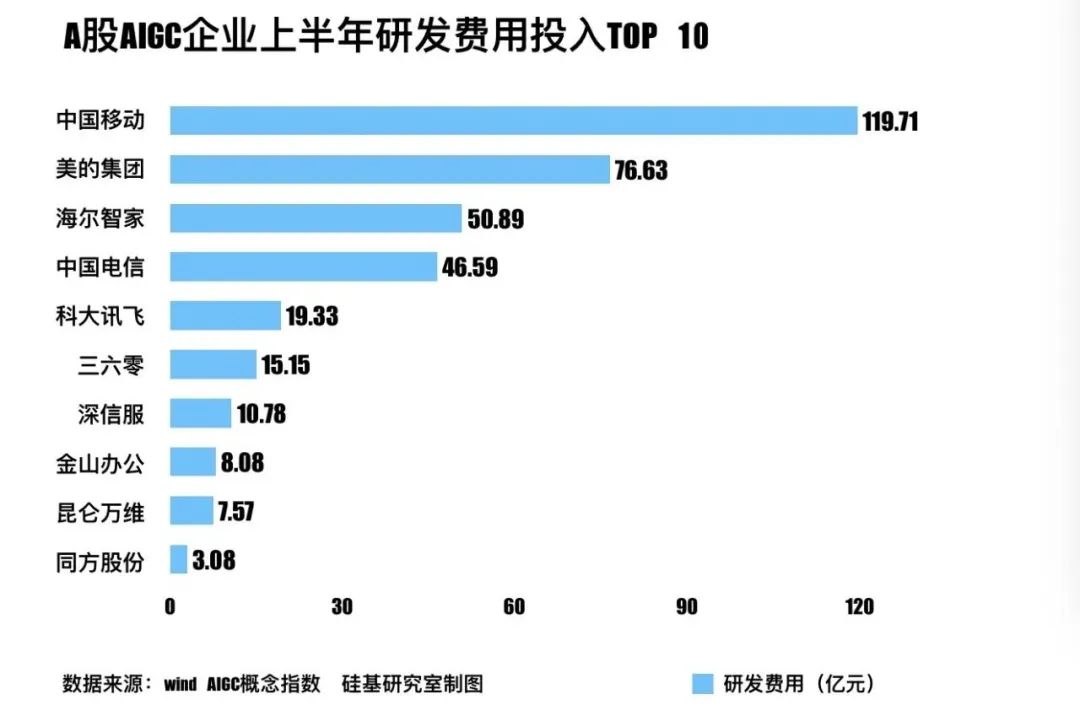 在55家AIGC企业中今年上半年的研发费用来看,有16家企业投入超1亿元,占比接近三成;7家企业投入超10亿元,占比约占1成,超百亿的仅有中国移动一家,半年研发费用就花了近120亿元,海尔智家和美的集团等家电龙头在研发端的投入也超过了50亿元。