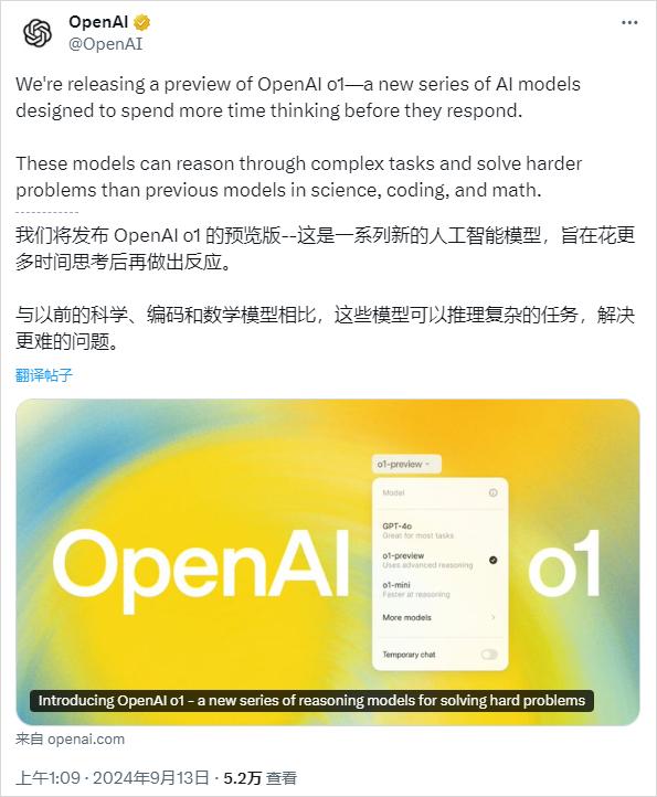 Open AI发布新一代大模型“o1”:会像人类一样“花时间思考”