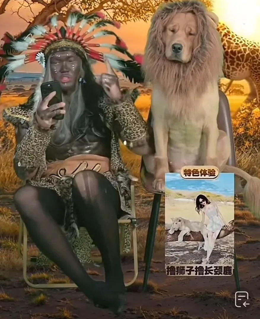最近某旅游博主宣传非洲团体旅游行程时,特意把自己打扮成土著模样,并把自家金毛狗狗打扮成“狮子”,吸引网友关注,还调侃“这就是金毛狮王吧”。