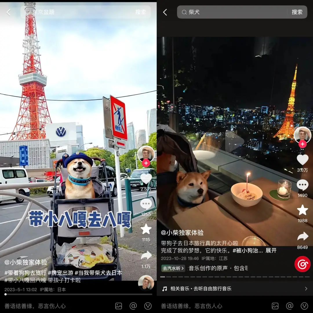 2021年12月,主人已经带着小柴向旅行博主转型,发布了多期“带着狗狗去旅行”相关主题视频,抖音账号名也改为“小柴独家体验”。