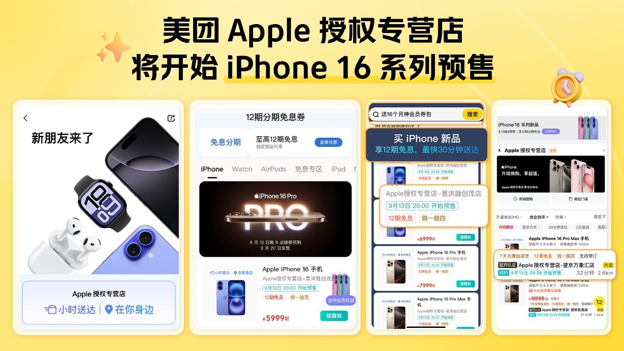 9月13日晚20点,iPhone 16系列将开启预售,美团平台全国数千家 Apple 授权专营店将同步开始“外卖预售”,消费者可享受最高12期分期免息,还可获得16个月神会员权益。
