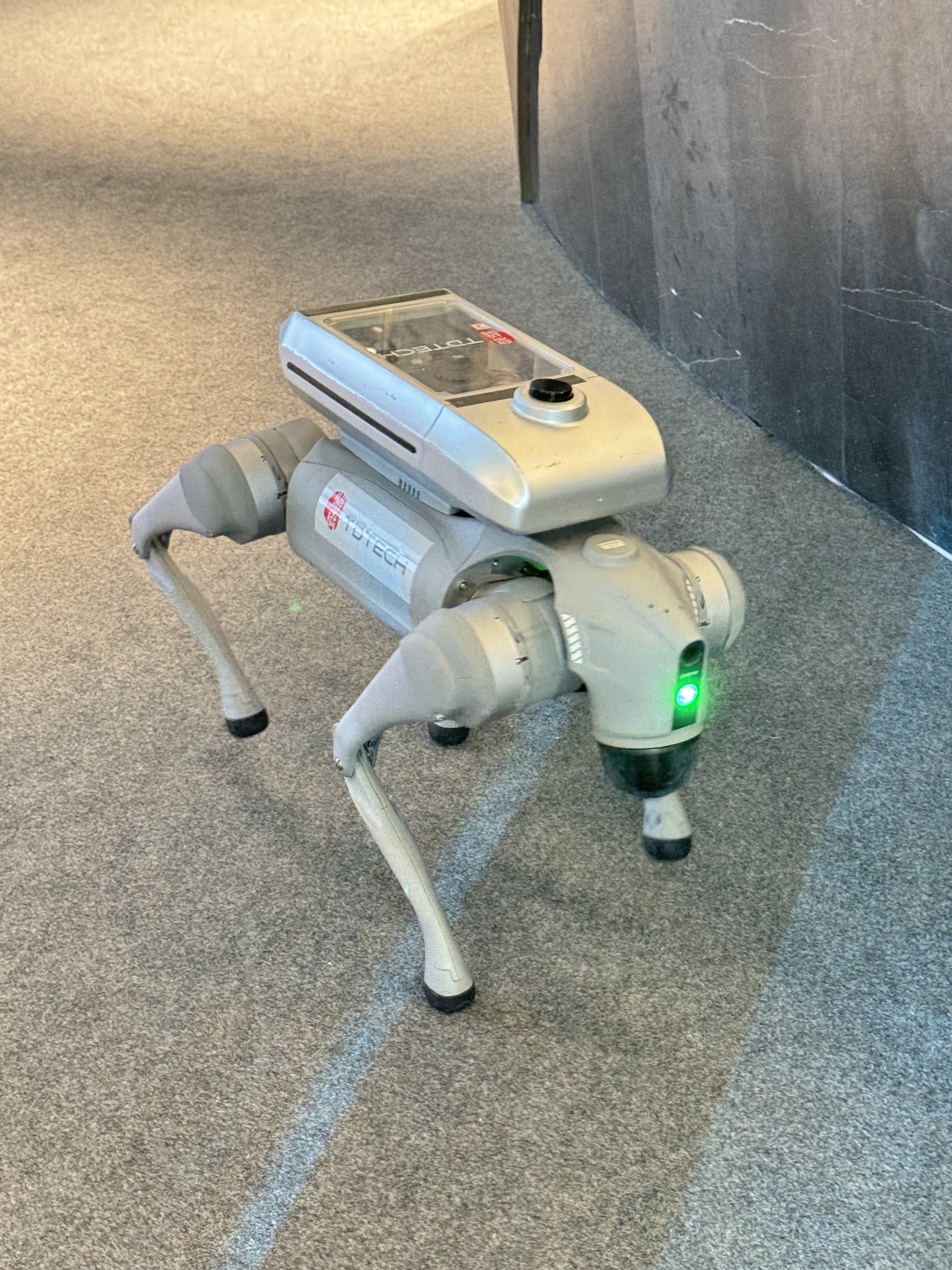 在大会开幕前,一个机器狗在人潮熙攘的会场兼职起了小小巡检员,随着一声指令下达,“匍匐”在地面的四足机器狗迅速起身,随后“噔噔噔”地开始巡检。