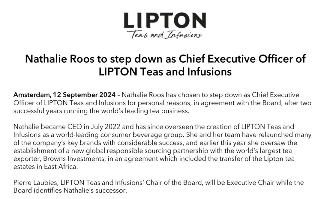 今天,总部位于荷兰阿姆斯特丹的立顿公司(LIPTON Teas and Infusions)宣布,在经营这家全球领先的茶公司两年后,Nathalie Roos因“个人原因”选择辞去立顿公司首席执行官一职,董事会已同意这一决定。资料显示,立顿公司由联合利华原茶叶业务剥离而来,目前由私募公司控制,Nathalie Roos是其首任掌门人。