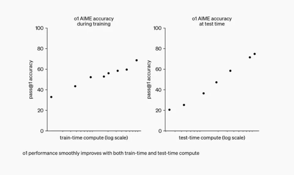 (随着更多强化学习(训练时计算)和更多思考时间(测试时计算)的投入,o1 的性能持续提升,但推理能力的加强比起预训练的加强增量更明显)