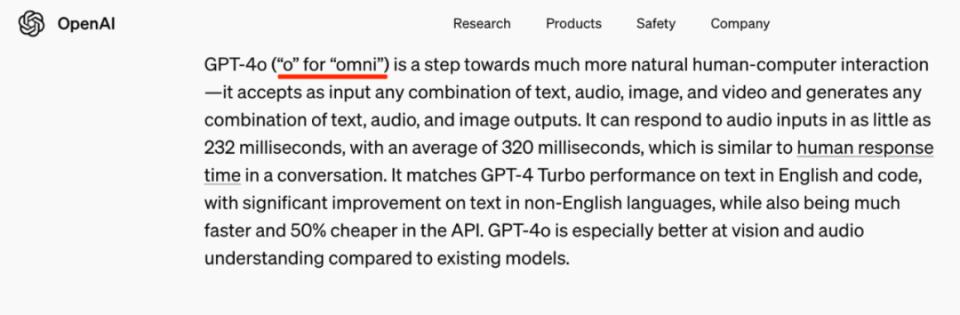 第一种猜测是,它沿袭了上一代模型GPT-4o中的“o”,OpenAI在今年5月份公布GPT-4o模型的时候提到,“o”代表“omni”,意思为“全能”,反应模型的多模态能力。