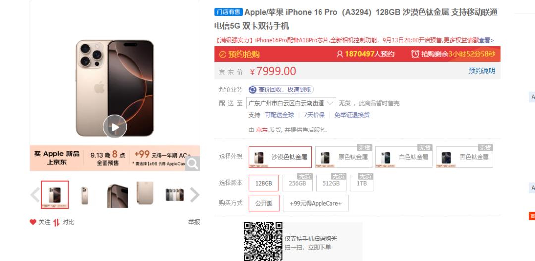 京东上iPhone16 Pro系列公开版在10分钟内被抢购一空,但+99元得AppleCare+的系列依旧有货,iPhone16系列全系目前也还可以购买。只是相比往年秒空的情况今年显得不那么好卖了。