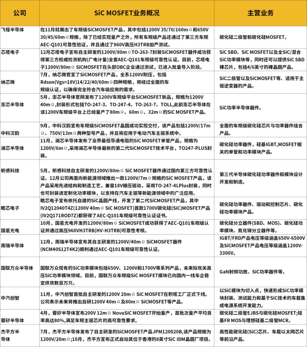 2023年国产厂商推出的车规SiC MOSFET产品