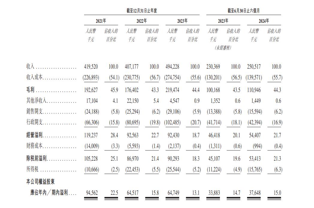 业绩方面,2021年、2022年、2023年及2024年上半年,爱维艾夫营收分别为4.20亿元、4.07亿元、4.94亿元及2.51亿元;毛利分别为1.93亿元、1.76亿元、2.20亿元及1.11亿元,毛利率分别为45.9%、43.3%、44.4%及44.3%;公司股东应占年内溢利分别为9654.2万元、6451.7万元、6479.4万元及3764.8万元,利润率分别为22.5%、15.8%、13.1%及15.0%。