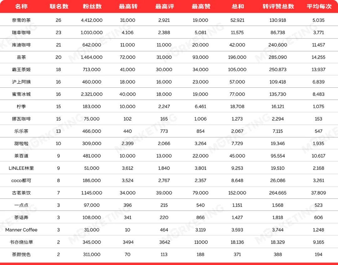 咖啡茶饮品牌今年上半年联名数据(图源Morketing)