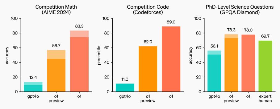 像下面的图里,三个测试项目的结果就能说明了,分别是国际数学奥林匹克竞赛、编程竞赛还有博士级别的科学问题。