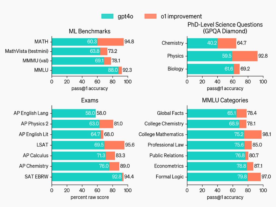 要是把这些测试结果拆开来,这新 o1 也几乎是在各种学科、各种领域,都全量、全面、全方位地超越 4o 。