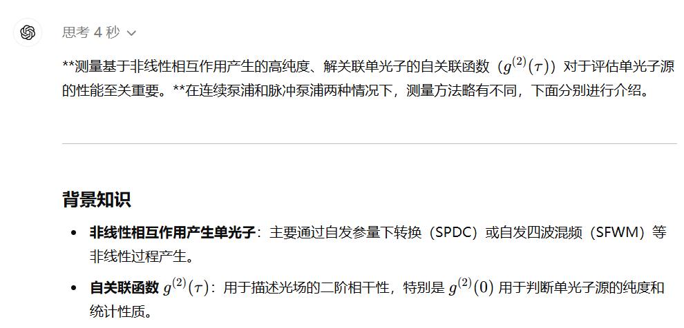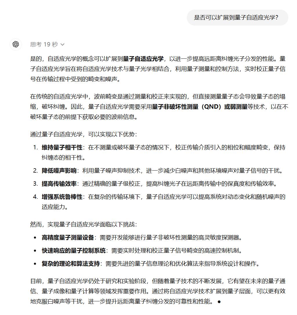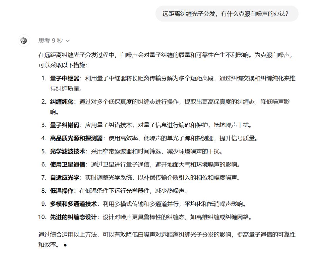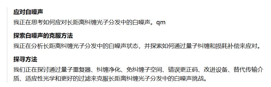 比如我们拿崔博士提问的 “ 远距离纠缠光子分发,有什么克服白噪声的办法? ” 这一问题为例, o1 模型的思考过程如下: