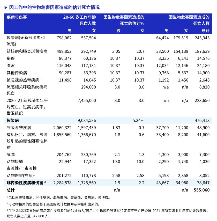 国际劳工组织(ILO)2024年发布的《工作环境中的生物危害因素》指出,2021 年,大约有55万人因在工作中接触生物风险因素而死亡,约占所有工作相关死亡人数的9.8%,给全球经济带来5480亿美元的巨大损失。