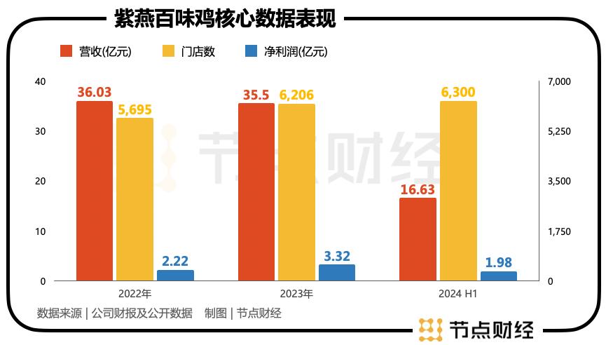据《节点财经》计算,紫燕食品的全国门店数分别在2023年以及2024年上半年增长超500/100家,但门店增长并未带动营收增长,哪怕是在绝味食品、周黑鸭同时营收回暖的2023年,紫燕食品当年营收仍然相比2022年减少了0.53亿元。