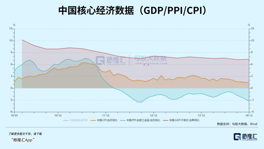 期间,制造业PMI同样大幅波动。比如2011年11月至2012年4月,制造业PMI从49%持续攀升至53.3%,而后至当年8月,则又大幅下滑至49.2%。再看PPI,2012年2月至2014年底,PPI均为负值,CPI也震荡走低,到2014年已经下滑至1.5%。