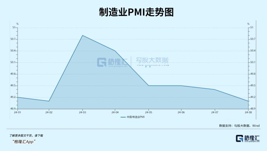 制造业PMI在今年3月、4月短暂冲上50景气度上方之后,一路下跌,8月最新制造业PMI为49.1。