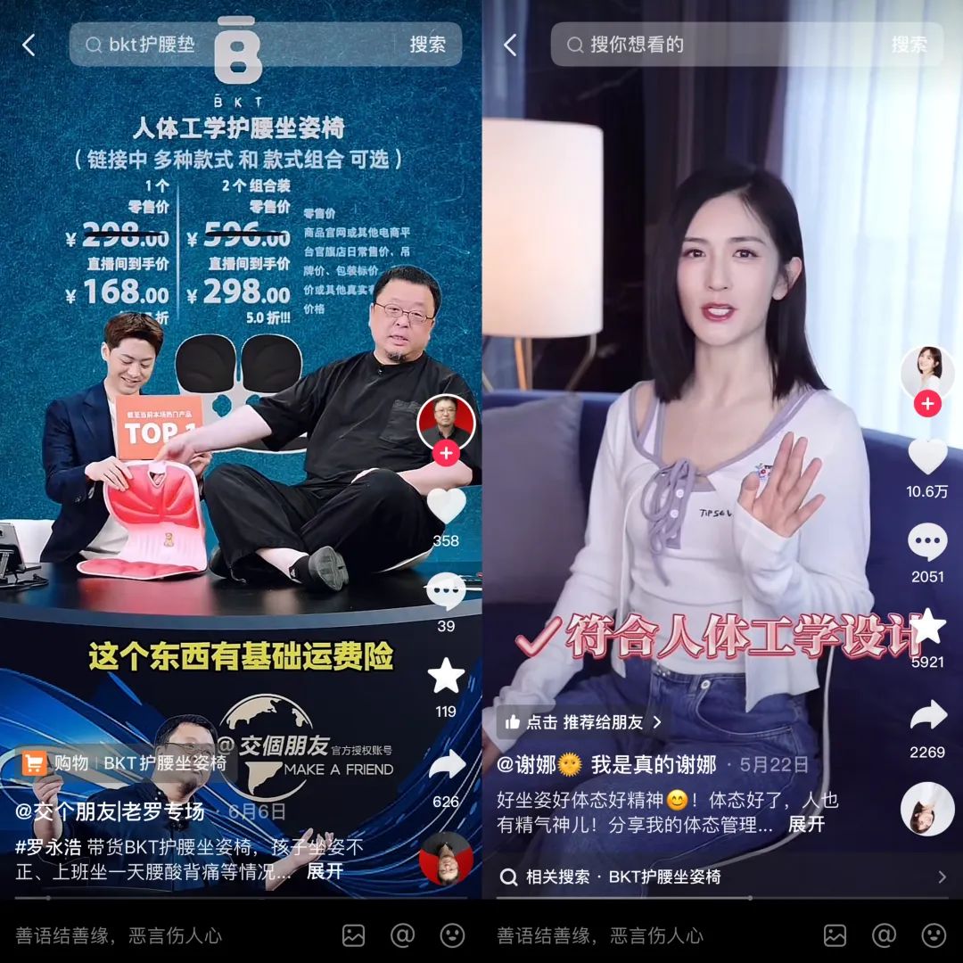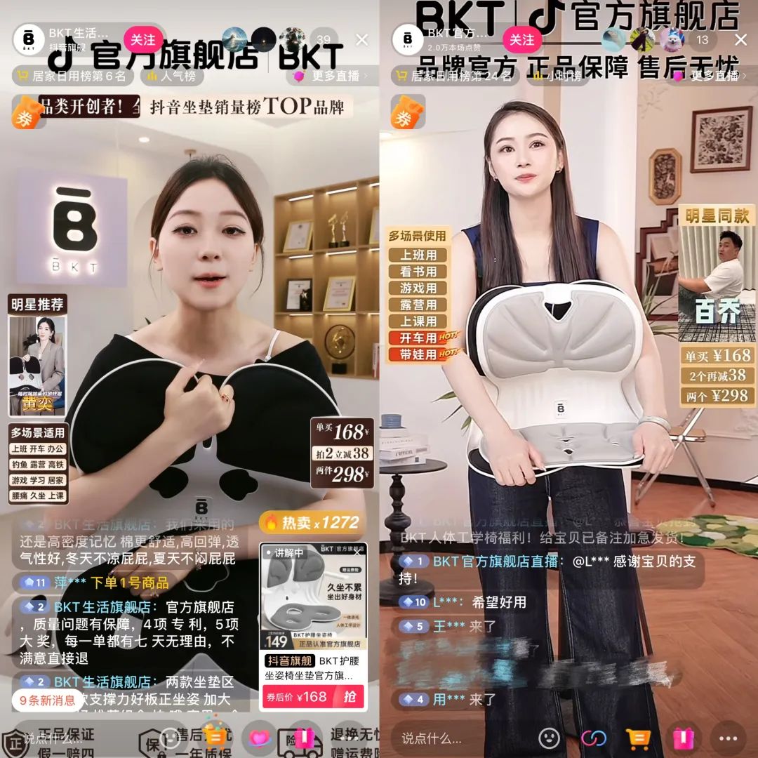 沥金分析认为,BKT之所以在护腰坐垫这条赛道上“一家独大”,是因为BKT重仓抖音,“直播带货的方式能最直观地展示护腰垫的功效,引发消费者的购买欲”。具体而言,BKT利用了明星和KOL的影响力,又通过品牌自营号的持续运营,确保了流量的稳定性和可持续性。
