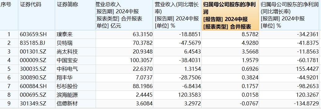 具体来看,2024年上半年,中科电气(300035.SZ)和滨海能源(000695.SZ)是唯二实现营业收入和净利润同步增长的公司;尚太科技(001301.SZ)和信德新材(301349.SZ)虽然收入有所增加,但净利润却未能同步提升;而璞泰来(603659.SH)、贝特瑞(835185.BJ)、中国宝安(000009.SZ)、翔丰华(300890.SZ)和杉杉股份(600884.SH)则面临营业收入和净利润双双下滑的局面。