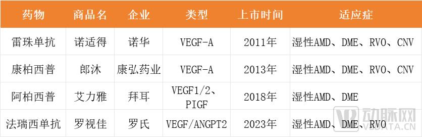 目前,全球已有雷珠单抗、阿柏西普、康柏西普和布西珠单抗、法瑞西单抗5款眼用抗VEGF药物获批上市。其中,雷珠单抗、康柏西普、阿柏西普和法瑞西单抗四款药物已经在中国获批上市。