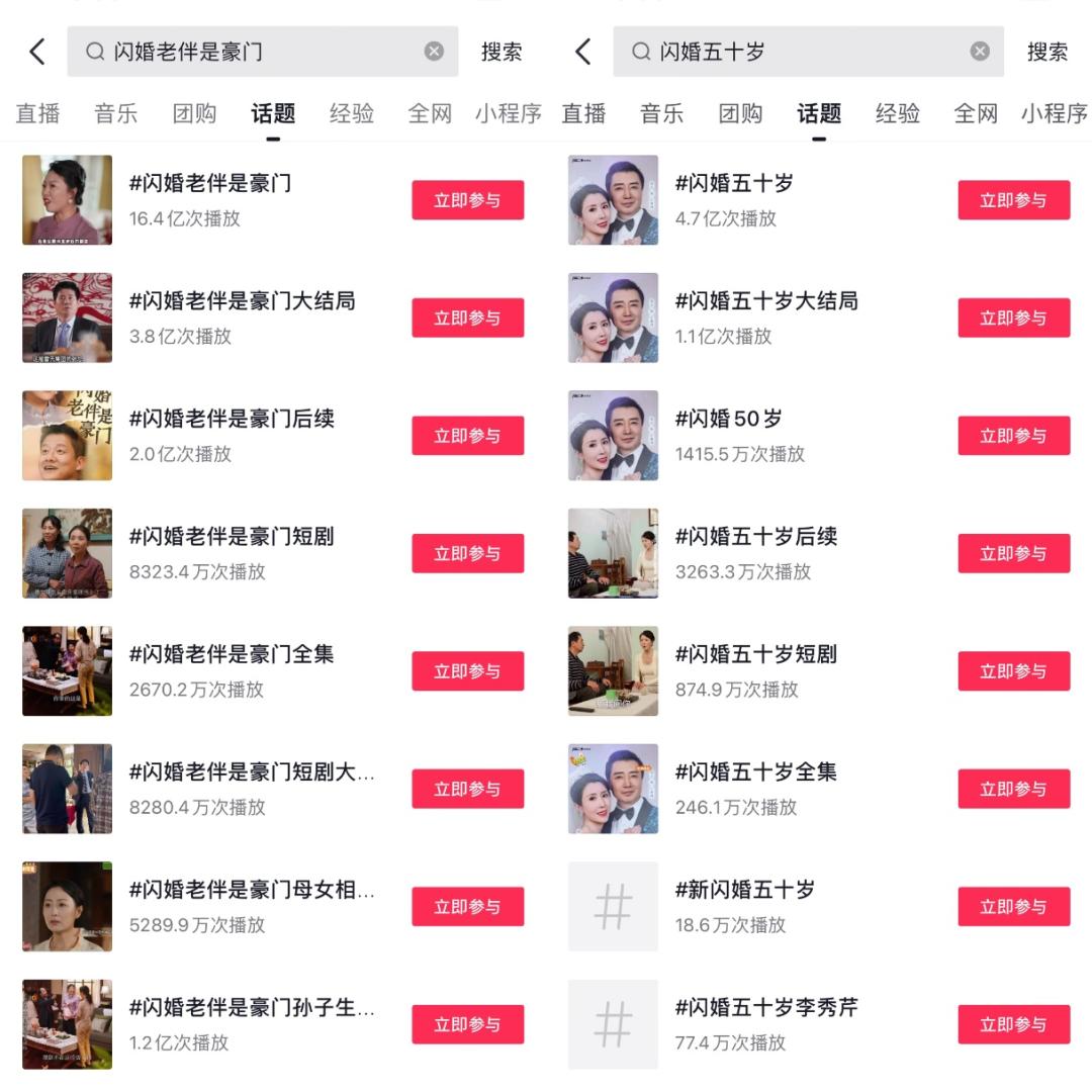 抖音《闪婚老伴是豪门》《闪婚五十岁》话题热度