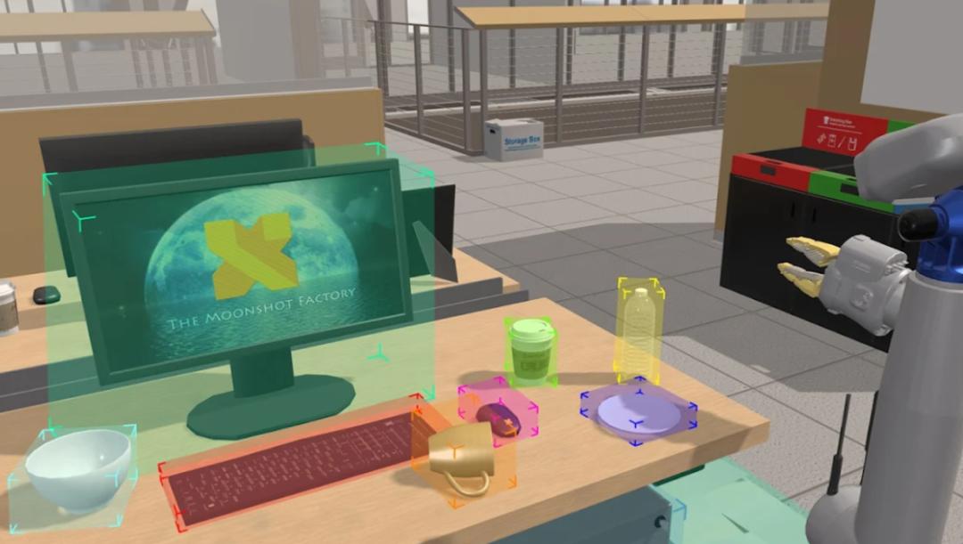 成千上万的虚拟机器人会使用它们的虚拟摄像头输入和虚拟身体(按照真实机器人建模)来执行任务,比如从桌子上捡起一个杯子。