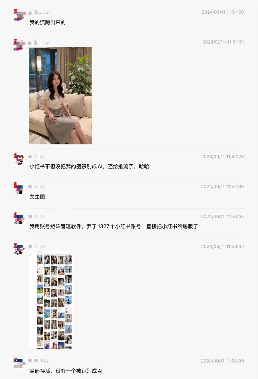 群聊记录显示,有网友宣称使用账号矩阵管理软件操控 1327 个账号,直接「屠版」小红书。结果,推送系统居然没识别出来,反而还帮着推流。