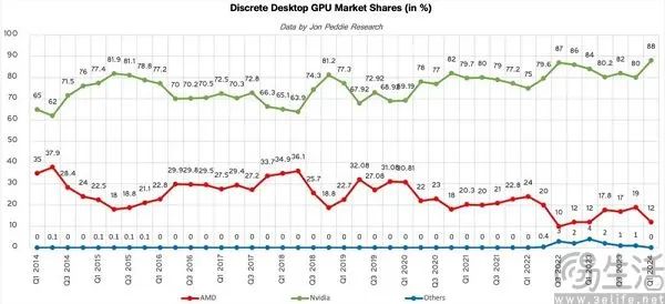 事实上,根据Jon Peddie Research的统计显示,截止今年第一季度,AMD在桌面独立显卡市场的份额仅为12%。而在高端领域,以Steam的数据为例,AMD Radeon RX7900 XTX的份额仅0.39%,而作为竞品的英伟达RTX 4090份额则是0.98%。