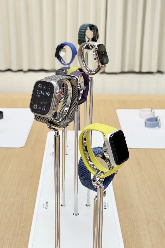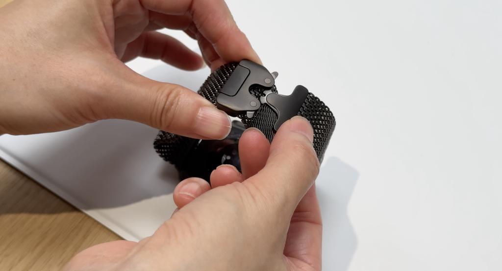 我很感兴趣的是这次跟Apple Ultra 2新颜色一同推出的新款米拉尼斯表带,在使用现场把玩了很久。老款米兰尼斯表带就是很实用的款式,精致、耐看,透气、调整方便,但也有一些细节问题,比如容易夹毫毛,有点单薄(尤其搭配Apple Watch Ultra使用的时候)等等。