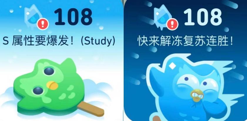 木子曾尝试过使用百词斩,但几次忘记打卡,纪录归零后,“想学习的气就泄了”。但多邻国在2022年推出的“连胜激冻”保护机制,可以为即将失去连胜的用户守护纪录。