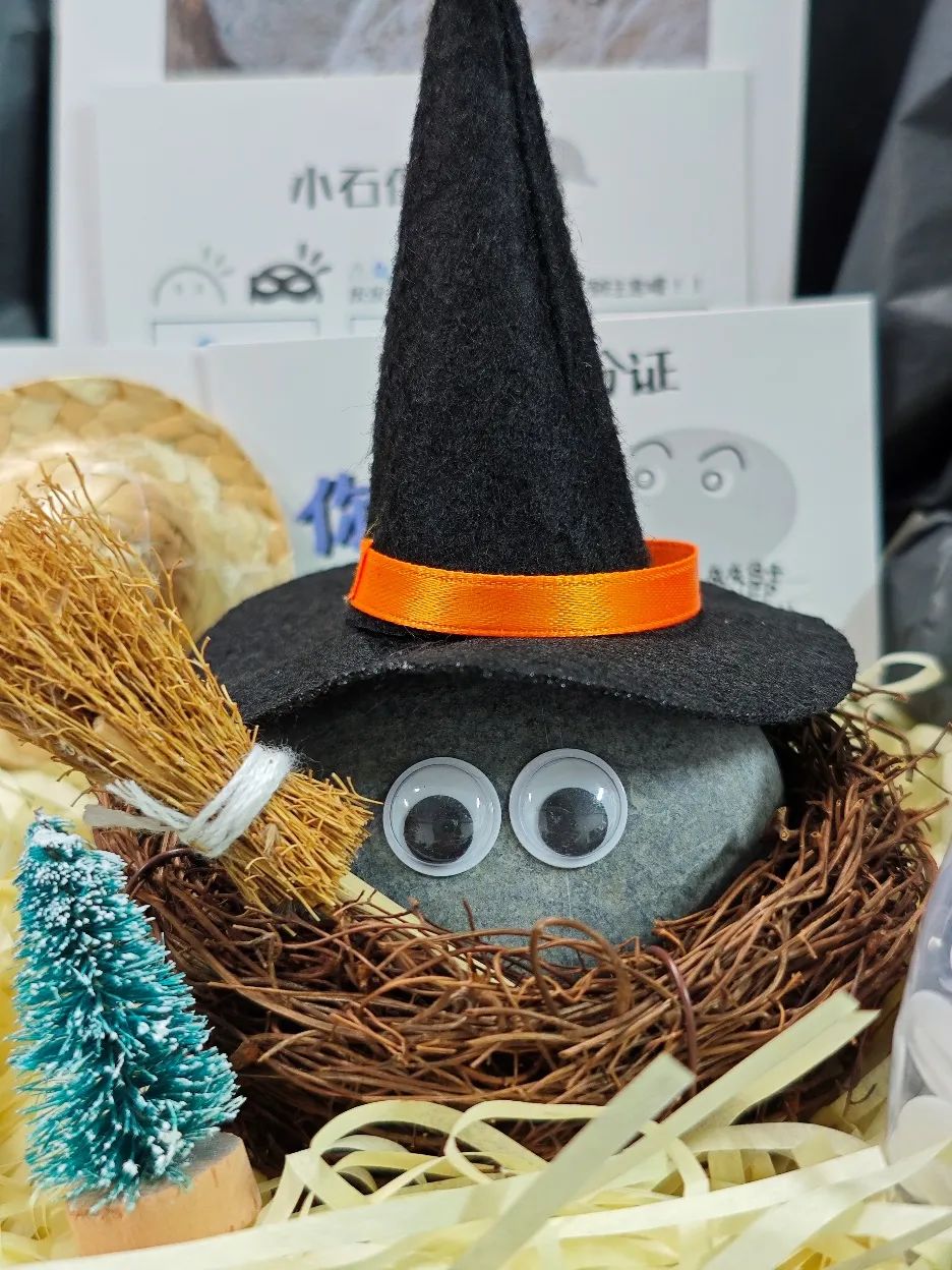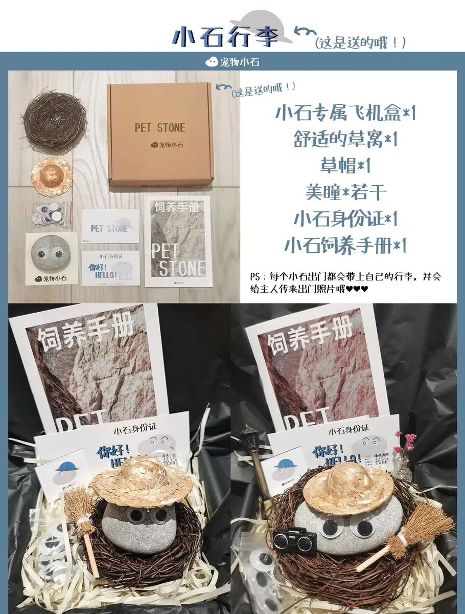 她给每块石头都贴上了一对“美瞳”,手写一张“身份证”,这是石头变宠物的第一步。给石头带上草帽,挑选合适的草窝,放好“饲养手册”和备用“美瞳”后,她就给石头主人发去“接机通知”:“小石已经收拾好行李,出发去找你啦!”