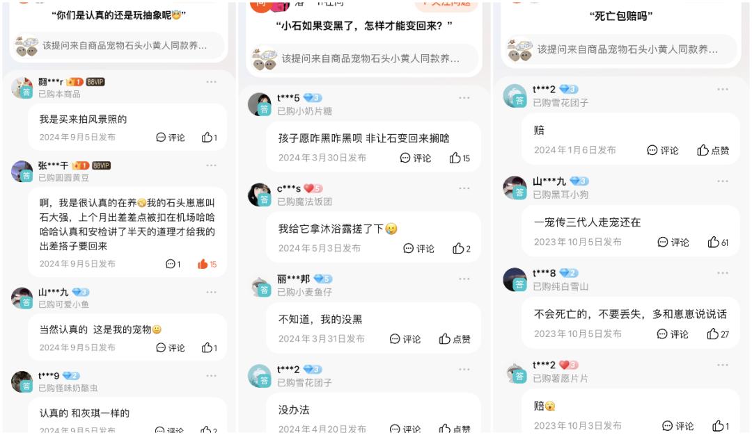 买家在提问区讨论如何让变黑的石头白回来,请教“该给孩子吃什么”,多久给它洗一次澡,认真的姿态像在养猫猫狗狗。