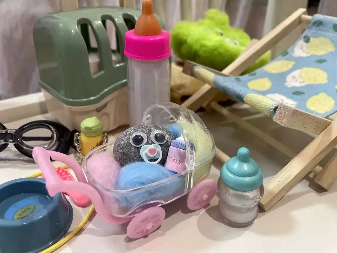 她们给石头配了一套行李,包括基础的眼睛、草帽、草窝、饲养手册等。还采购了一批微缩景观道具,比如路灯、可乐、电话、大提琴……搭上拟人场景的道具,小石头瞬间生动了。