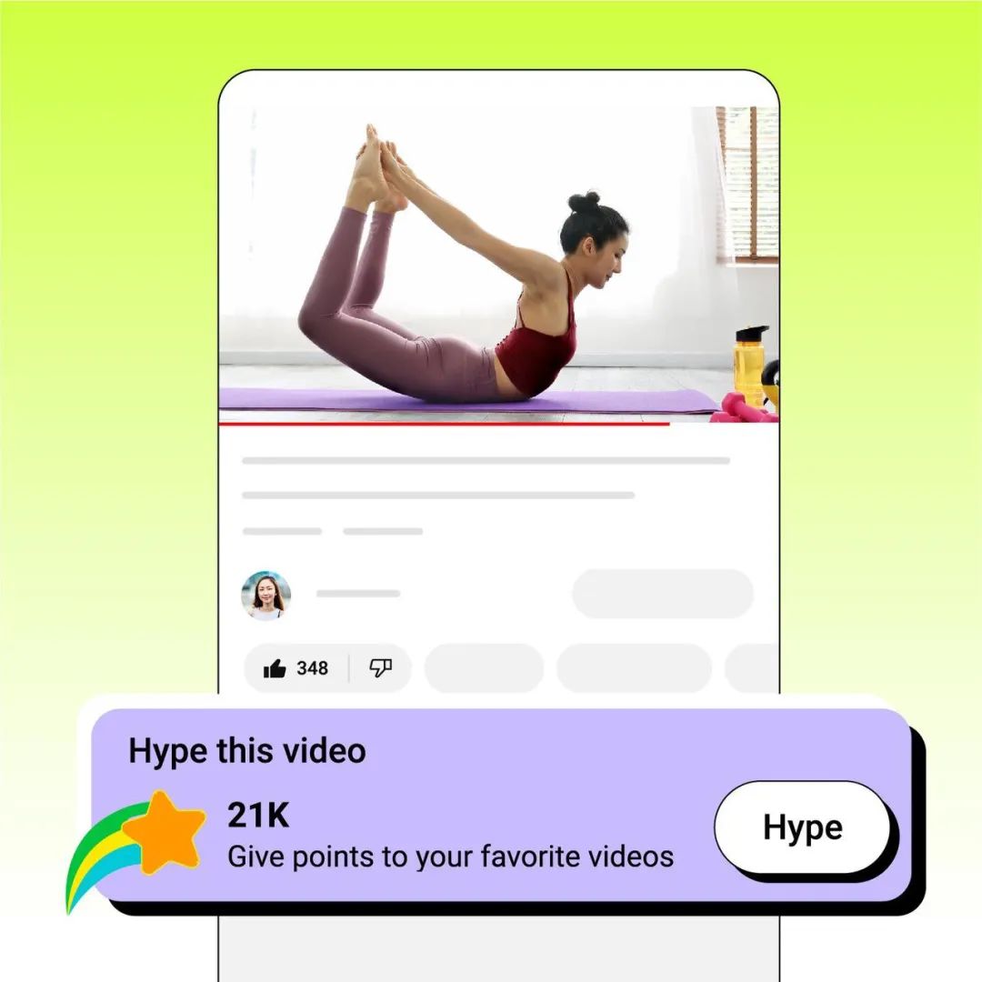 在社区功能之外,同样是为了增加用户参与感,又或者是为了换个法子变现,YouTube 还推出了「Hype」功能——这个词有「大肆宣传、炒作」的意思,粉丝可以点击这个新的按钮来支持新人创作者,比普通的点赞更有分量,每个用户每周只有三次免费「Hype」机会,多了要交钱,据称一次可能是 2 美元,创作者也会获得一笔奖金。