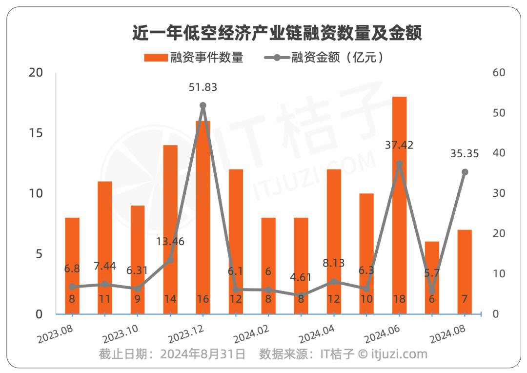 进入2024年年初,低空经济产业链的投资热情有所下降,投资事件数量平均每月维持在10件左右;进入2024年下半年,投资事件数量于2024年7月跌至6件,创造了近一年来的新低,环比下降66.7%。今年8月,低空经济产业链的投资事件数量为7起。