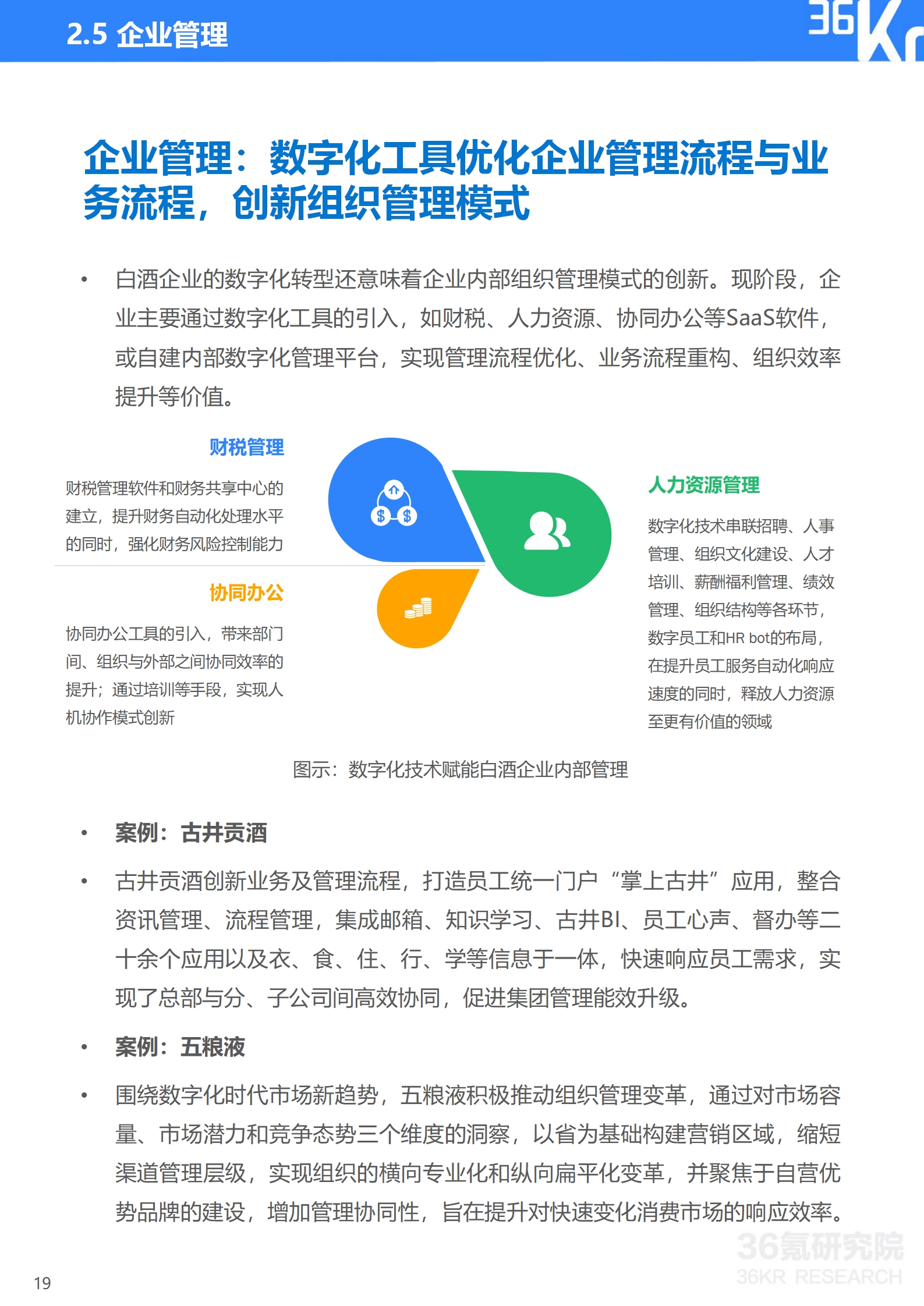 4)企业管理。目前,白酒企业主要通过数字化工具的引入,如财税、人力资源、协同办公等SaaS软件,实现管理流程优化、业务流程重构、组织效率提升等价值。