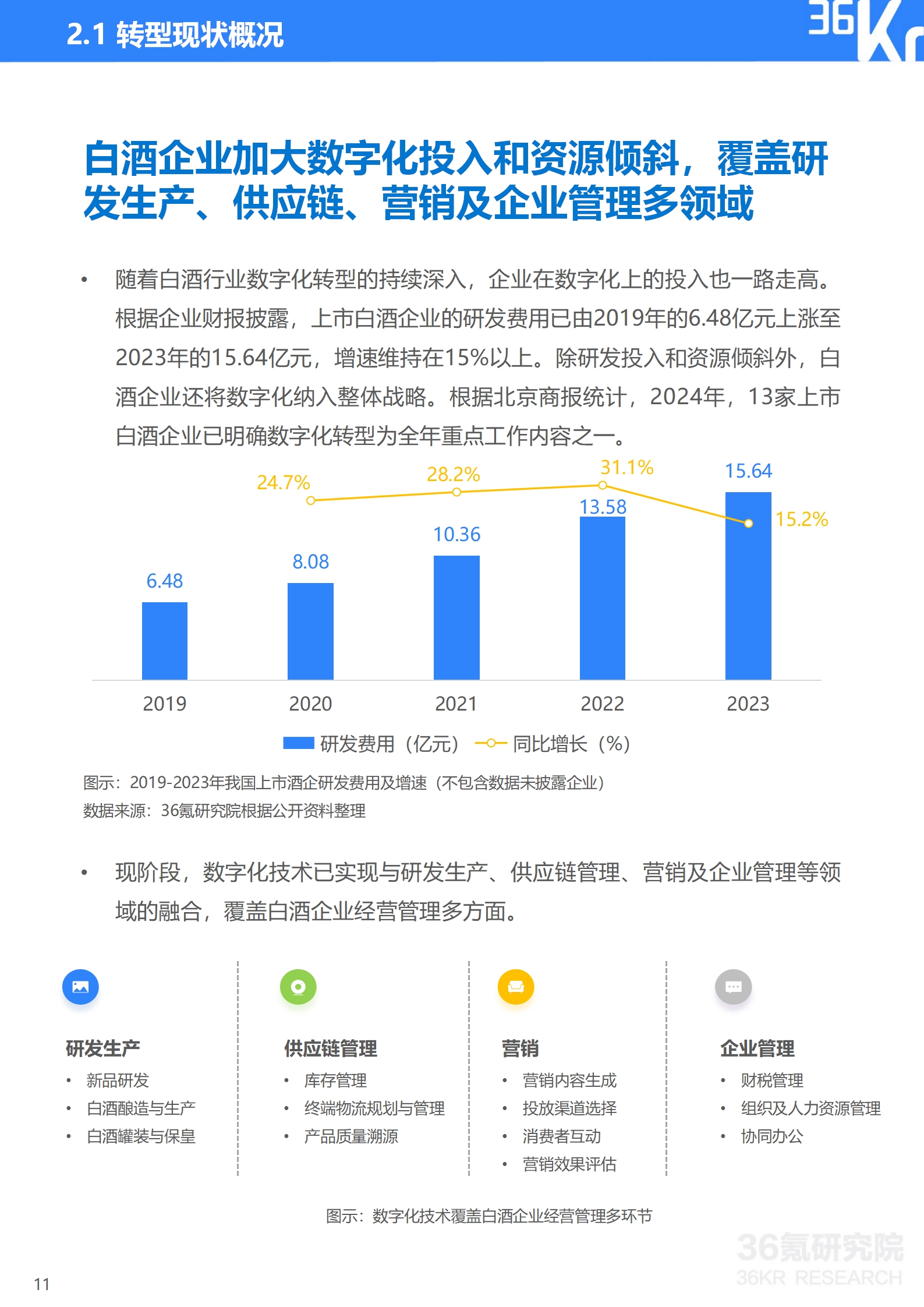 现阶段,白酒行业的数字化主要表现在研发生产、供应链管理、营销与消费者互动及企业管理等维度,覆盖企业经营管理多方面。