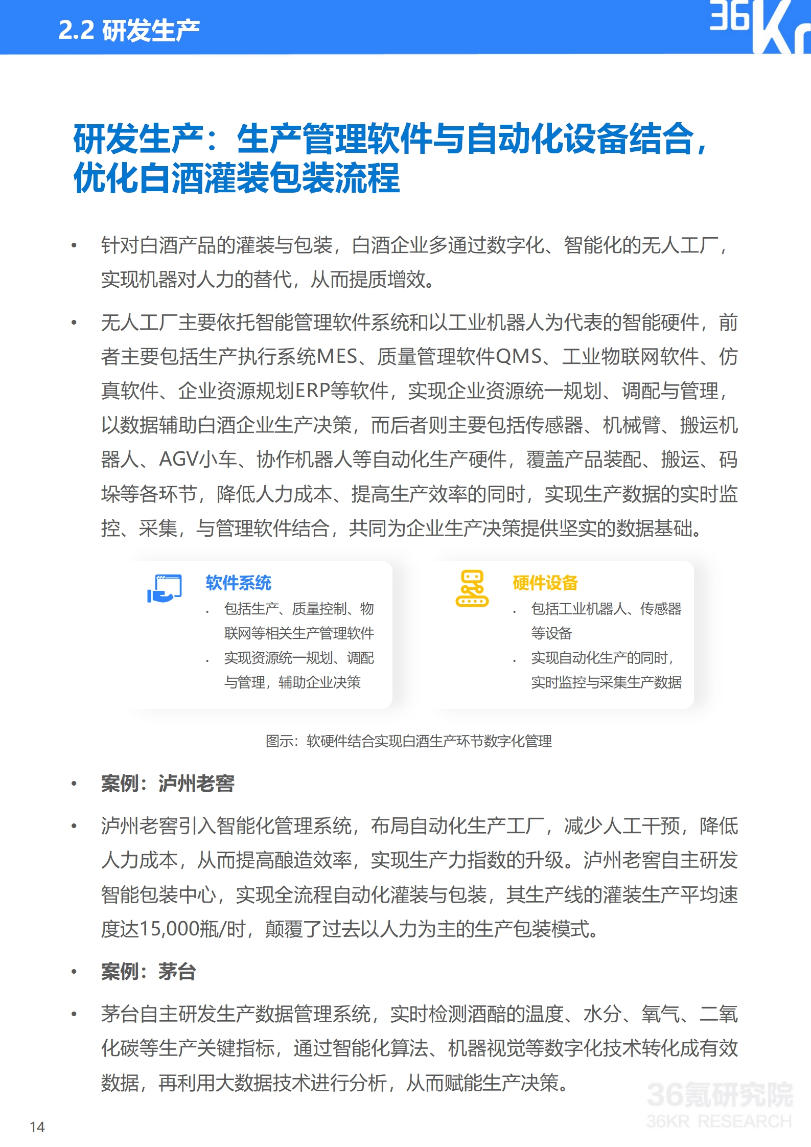 1)研发生产。数字化技术贯穿产品研发、白酒酿造、灌装及包装环节。得益于数字化技术的应用,特别是人工智能与大数据的深度融合,白酒企业能够在深度洞察消费需求的前提下,提升市场响应敏捷性和研发创新水平,以消费者为核心优化产品供给组合。而生产管理软件和自动化设备的结合,使得白酒企业在酿造生产部分环节以机器替代人力,实现自动生产、数字集成与智能分析,在降低人力成本的前提下,提升生产能效并进行标准化质量管理。