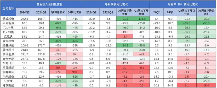 下图为光伏主环节企业在Q1和Q2单季度的营业收入、净利润同比变动情况,我们以红绿色阶对各家企业的营收同比变化,以及亏损幅度进行排序,可以发现的一个明显的特点是:
