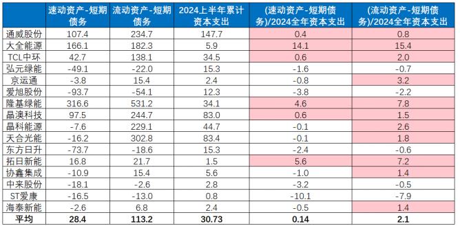 假如流动资产-短期债务的差额作为企业的剩余资金,2024全年的资本开支与2024上半年保持一致,统计中的16家公司平均可支撑2年左右。