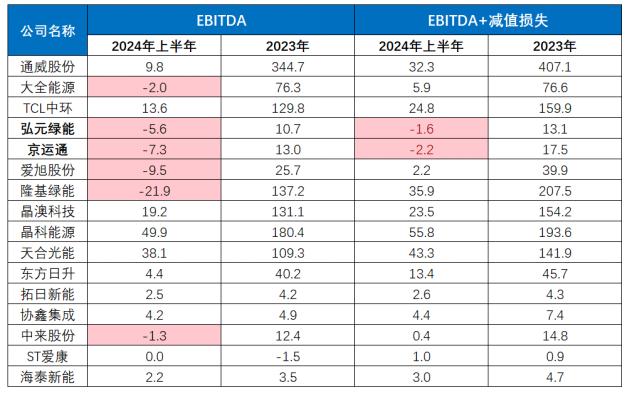 在对十六家光伏主材企业的EBITDA进行统计后,可以看到尽管光伏企业在2024上半年的净利润是巨亏状态,但在加回折旧摊销、资产减值损失后,仅弘元绿能(上机数控)、京运通处于现金亏损状态。